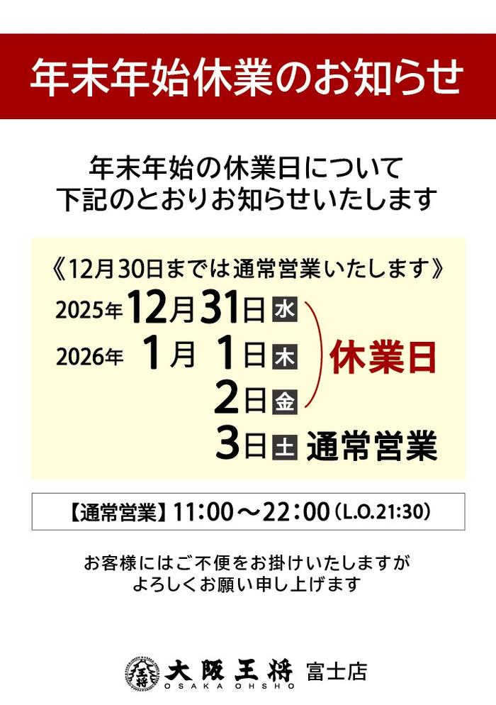大阪王将 【大阪王将 富士店・静岡下川原店】年末年始休業のお知らせ 2025/12/01 日頃より、大阪王将をご愛顧いただきまことに有難うございます。 年末年始の休業日について下記のとおりお知らせいたします。 【12月30日までは通常営業いたします】 2025年12月31日(水)~2026年1月2日(金)まで休業 1月3日(土)から通常営業 お客様にはご不便をお掛けいたしますが よろしくお願い申し上げます。 大阪王将 静岡下川原店(店舗情報) Tel.054-268-1504 地図はこちら 大阪王将 富士店(店舗情報) Tel.0545-57-1504 地図はこちら