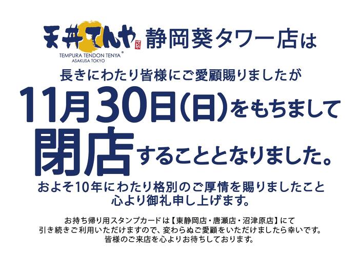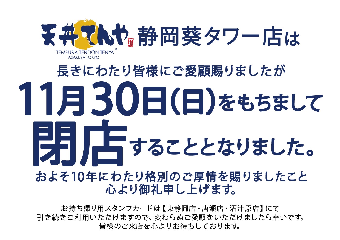 天丼てんや 【天丼てんや 静岡葵タワー店】閉店のお知らせ 2025/11/03 日頃より、天丼てんや 静岡葵タワー店をご愛顧いただきまことに有難うございます。 長きにわたり皆様にご愛顧賜りましたが 11月30日(日)をもちまして閉店することとなりました。 およそ10年にわたり格別のご厚情を賜りましたこと 心より御礼申し上げます。 お持ち帰り用スタンプカードは【東静岡店・唐瀬店・沼津原店】にて 引き続きご利用いただけますので、変わらぬご愛顧をいただけましたら幸いです。 皆さまのご来店を心よりお待ちしております。