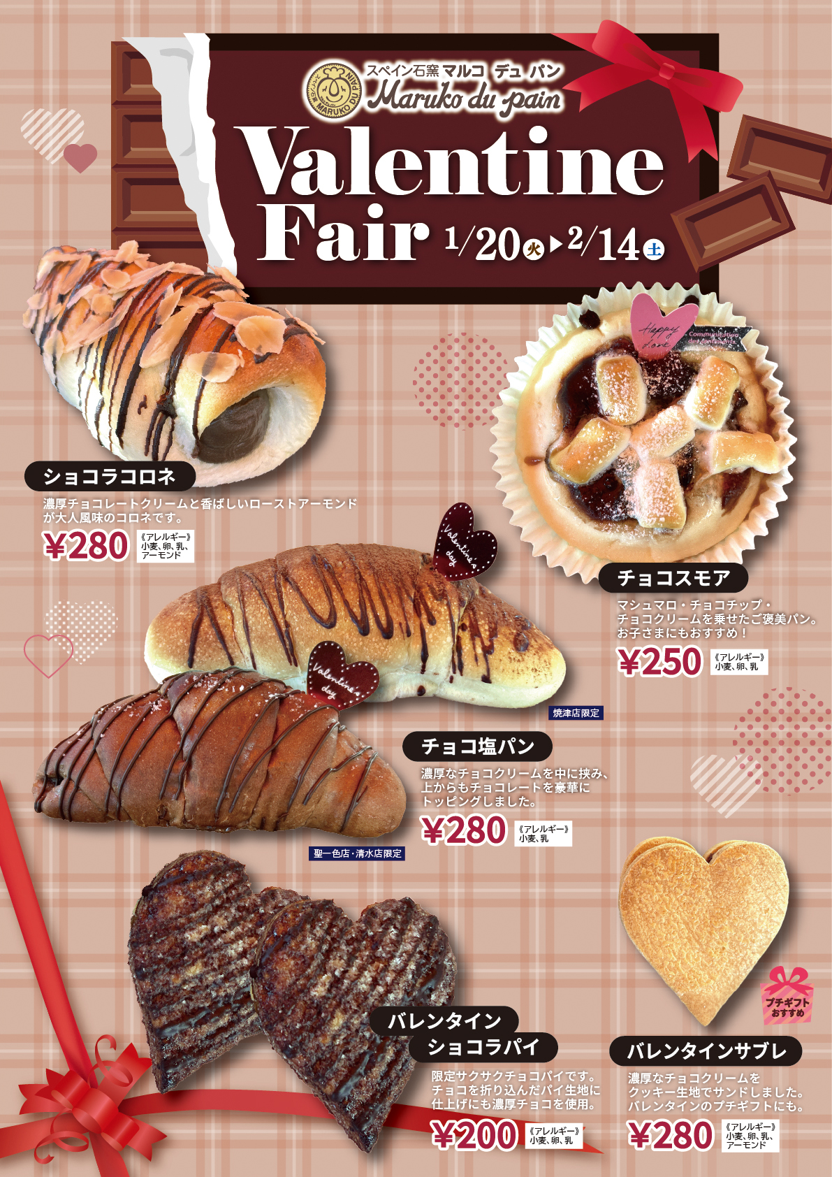 マルコデュパン 《期間限定》バレンタインフェア🍫1/20(火) 発売開始! 2026/01/16 《1/20(火)〜2/14(土)の期間限定!》 チョコ好きにはたまらないラインナップが登場します✨ 自分へのご褒美やプチギフトにもぴったり🎁 ぜひマルコで甘いひとときをお過ごしください🥖 ※販売予約は1つから、 ご希望の店舗でお電話にて承ります! 〇聖一色店/054-267-0505(地図) 〇清水店/054-349-0505(地図) 〇焼津店/054-626-0505(地図) 各店情報はこちら