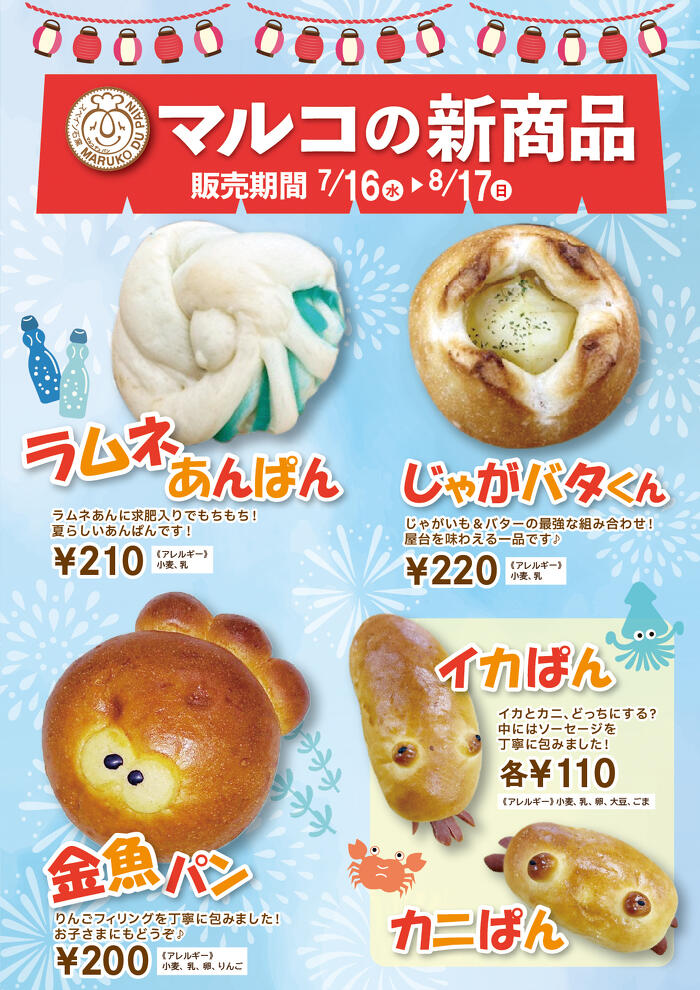 マルコデュパン 《期間限定》夏シリーズパン🌻7/16(水) 発売開始! 2025/07/15 夏休みがいよいよスタート! そんなウキウキの季節ピッタリな 夏休みらしい限定パンが揃いました◎ ラムネあんを包んだ「ラムネあんぱん」をはじめ、かわいらしい「金魚パン」など 夏を楽しめるラインナップをぜひお楽しみください!😊 《7月16日(水)~マルコ デュ パン全店で発売開始!》 ※販売予約は1つから、 ご希望の店舗でお電話にて承ります! 〇聖一色店 054-267-0505 〇清水店 054-349-0505 〇焼津店 054-626-0505 各店情報はこちら