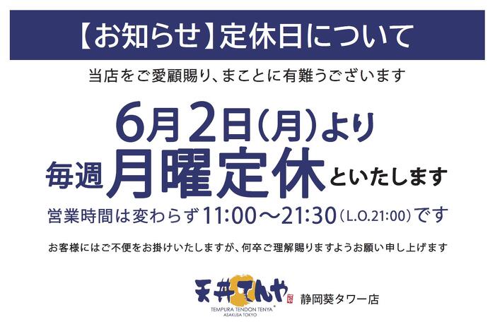 天丼てんや 【てんや 静岡葵タワー店】6月2日(月)より月曜定休といたします 2025/05/22 当店をご愛顧賜り、まことに有難うございます。 6月2日(月)より毎週月曜定休といたします。 営業時間は変わらず11:00~21:30(L.O.21:00)です。 お客様にはご不便をお掛けいたしますが 何卒ご理解賜りますようお願い申し上げます。