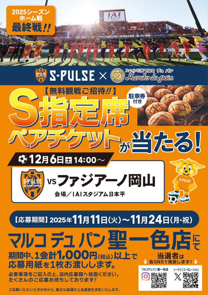 【マルコ 聖一色店】清水エスパルス S指定席観戦ペアチケットプレゼント